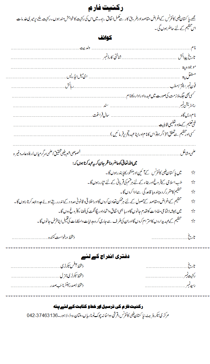 رکنیت فارم پر کرے اور فارم پر مندرجہ حلف وفاداری پر عمل کرنے کے لئے آمادہ ہو اور مقررہ کردہ فیس رکنیت ادا کرے۔